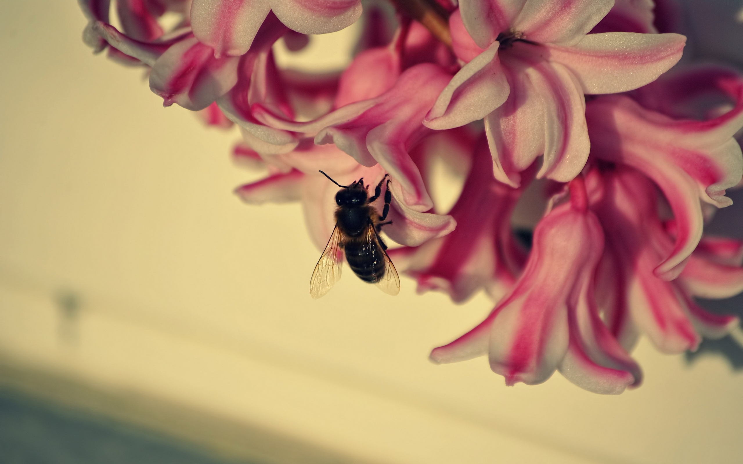 Description: A bee is flying around a bunch of flowers in a vase of watercolor pencils on paper.