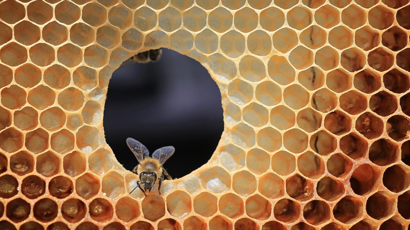 Description: A bee is seen through a honeycomb with a hole in the middle of it that is filled with honey.