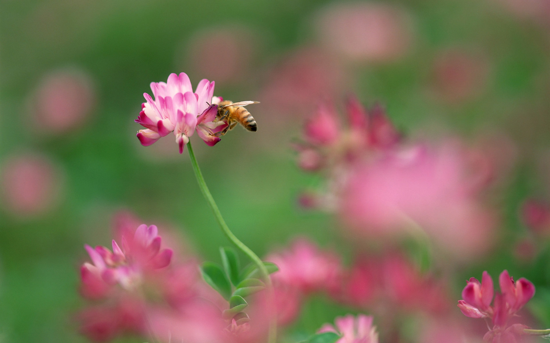 Description: A bee is on a pink flower in a field of pink flowers with green leaves in the background and a blurry background.