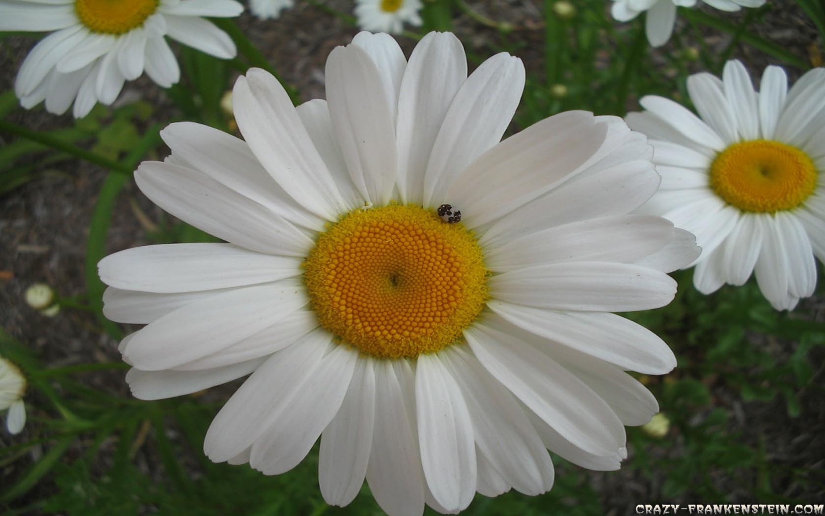 Description: A bee is sitting on a white flower with yellow center and a yellow center on the center of the flower.
