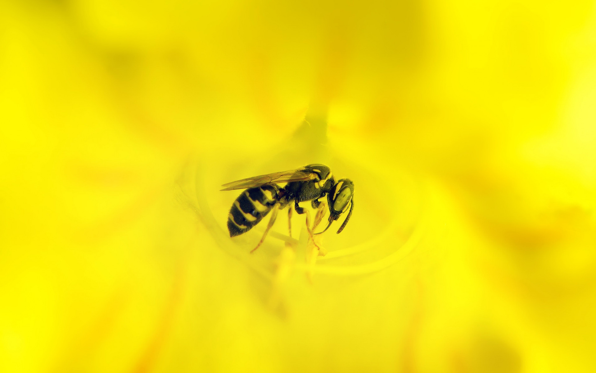Description: A bee is sitting on a yellow flower with its head in the center of the picture.