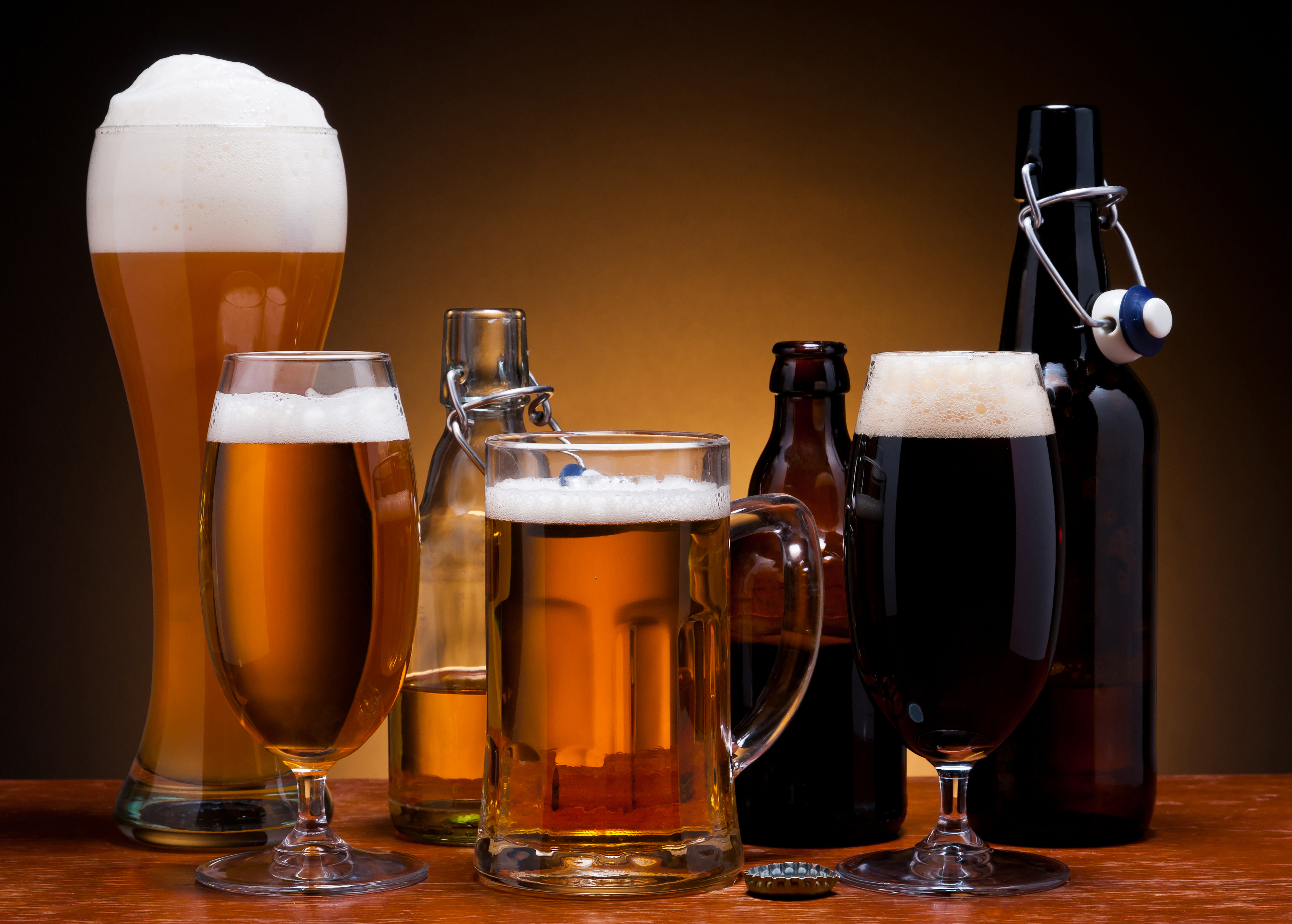 Description: A table topped with lots of different types of beer glasses and bottles of beer next to each other on a wooden table.