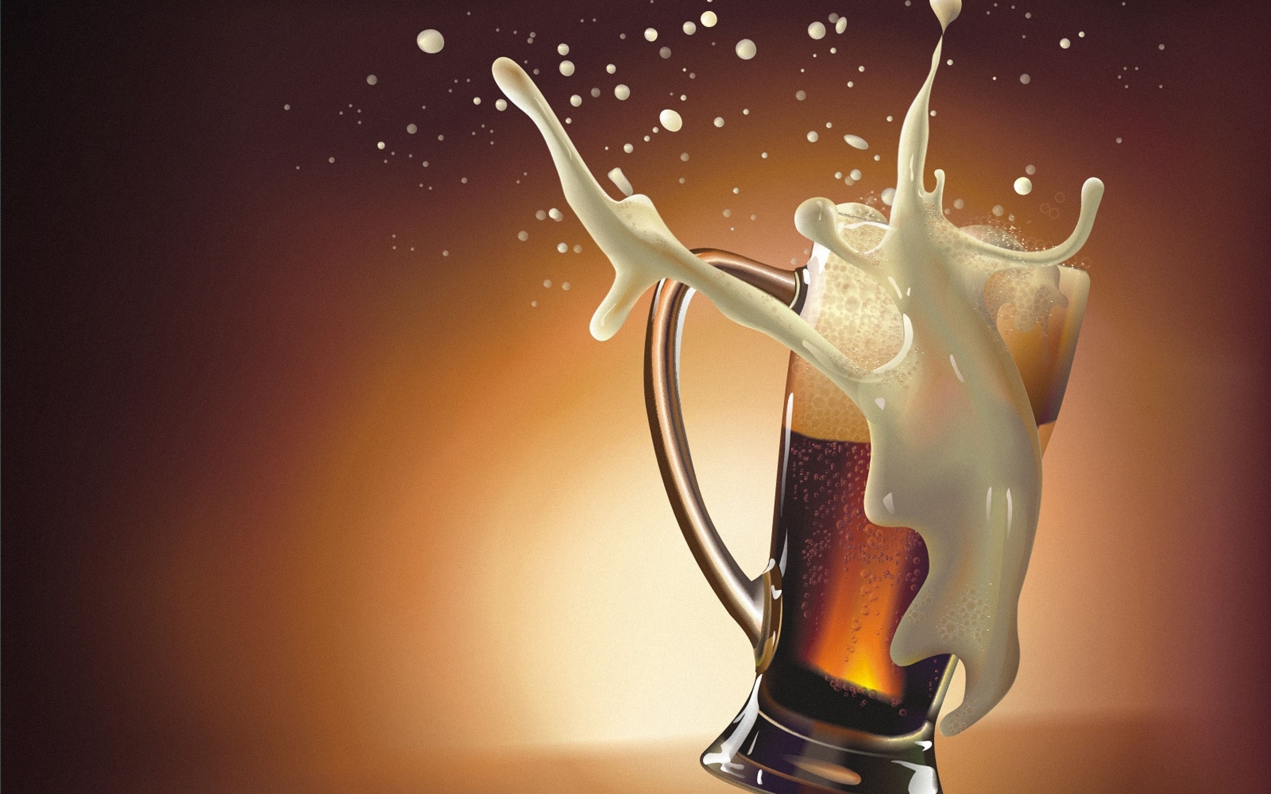 Description: A glass of beer with a splash of milk on top of it and bubbles coming out of the top.
