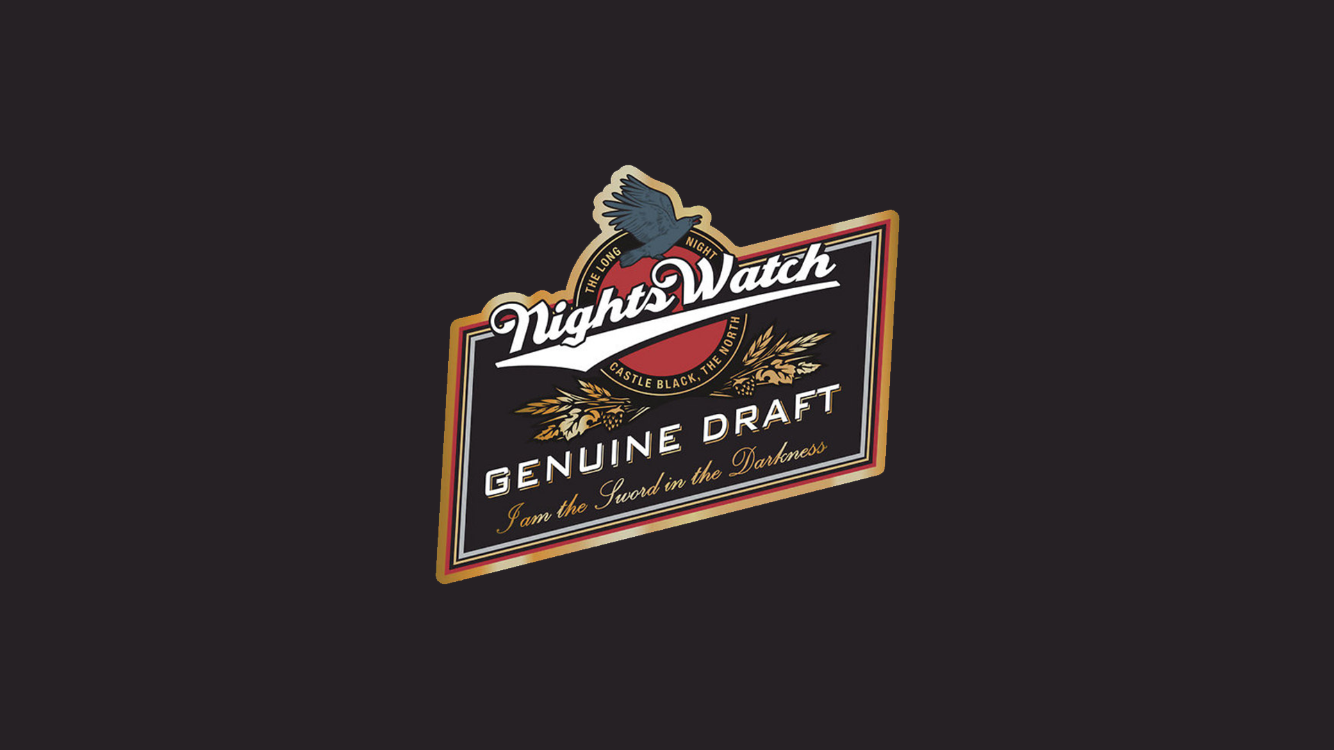 Description: A sign for a beer company on a black background with a red and white bird flying above it and a black background.
