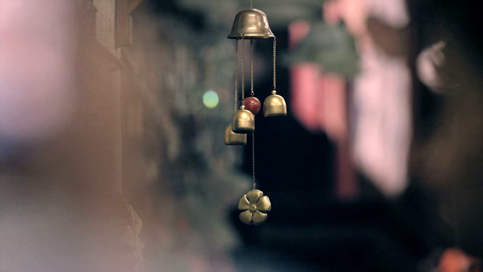 Description: A bell hanging from a wall with bells attached to it's sides and a shamrock on the bottom.