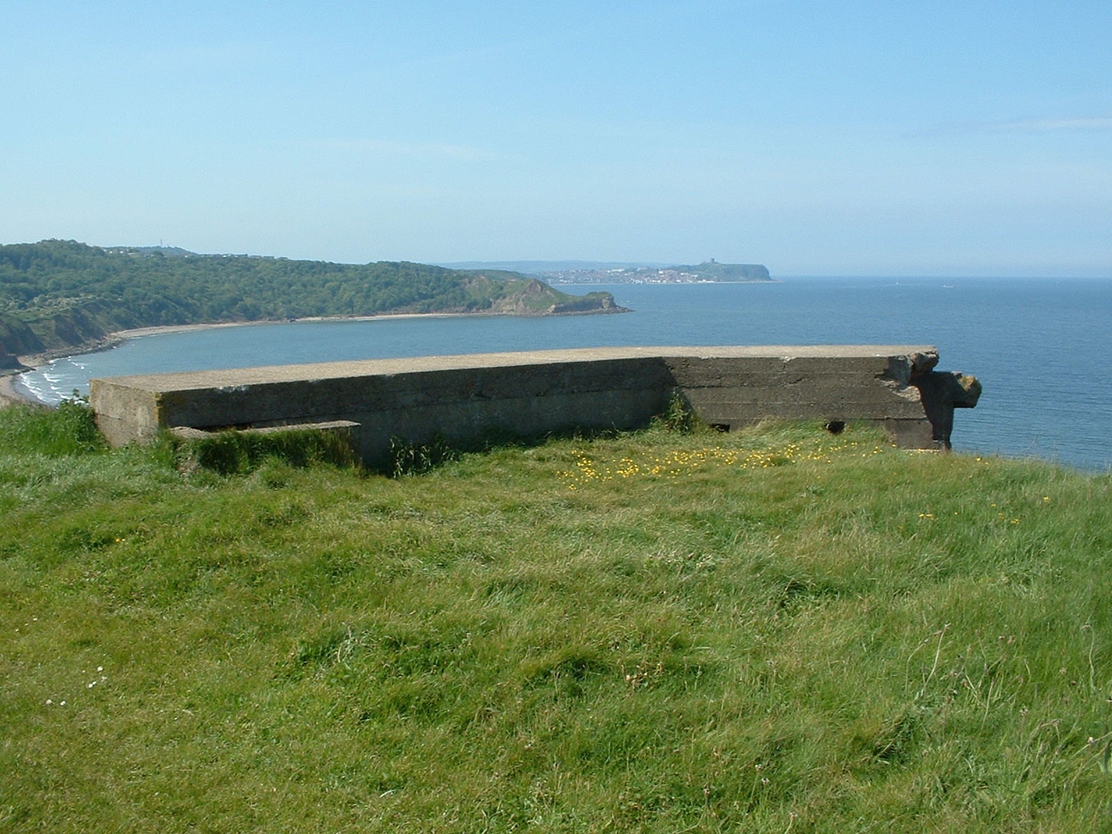 Description: A bench sitting on top of a lush green hillside next to the ocean with a cow standing on the grass.