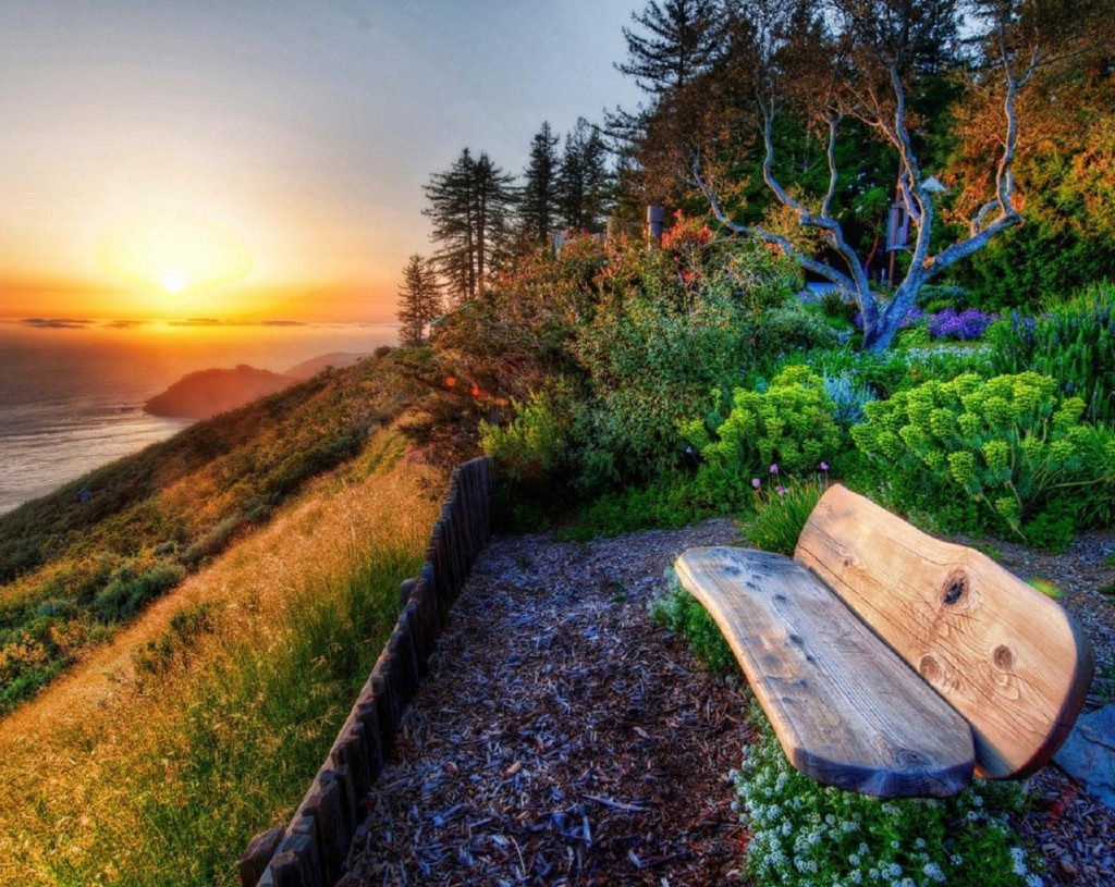 Description: A bench sitting on top of a lush green hillside next to the ocean at sunset or sunrise time with a view of the ocean.