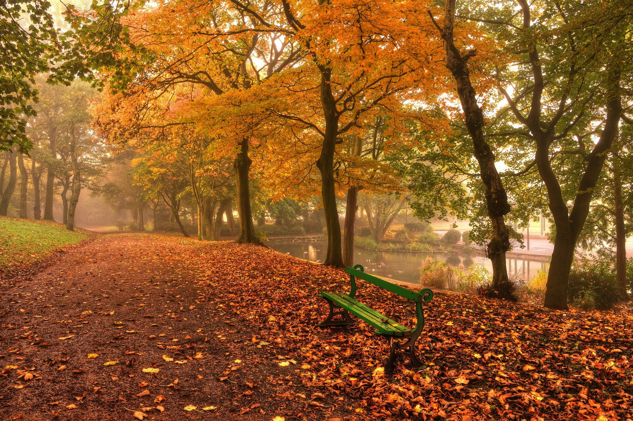 Description: A bench sitting on a leaf covered path next to a river in a park with trees and leaves all around.