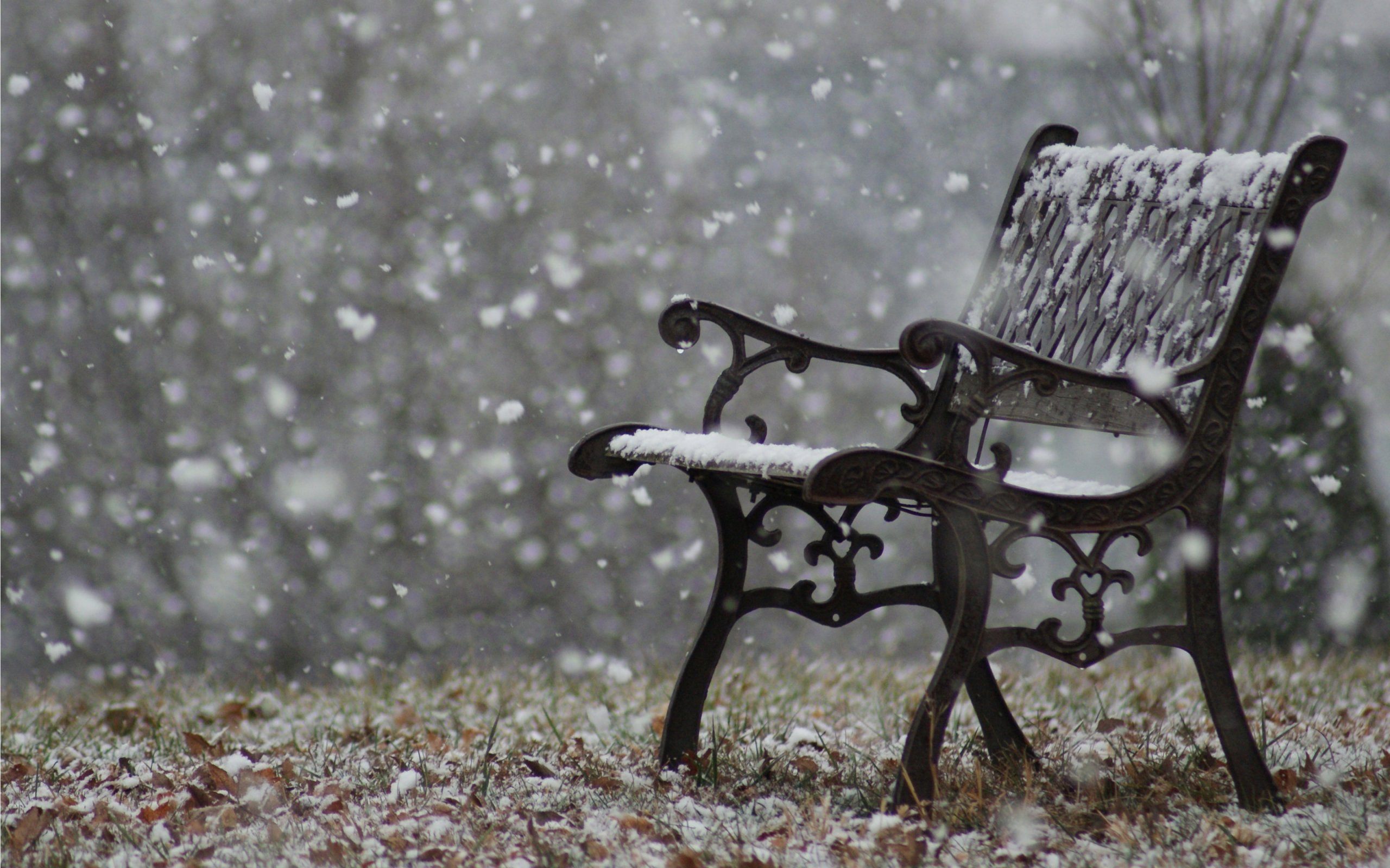 Description: A bench sitting in the middle of a field covered in snow with a tree in the background and falling snow.