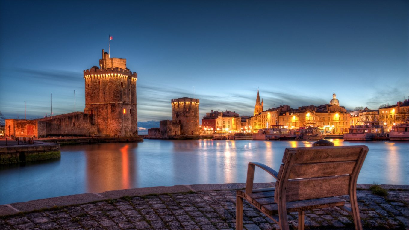 Description: A bench sitting on a stone walkway next to a body of water at night time with a castle in the background.