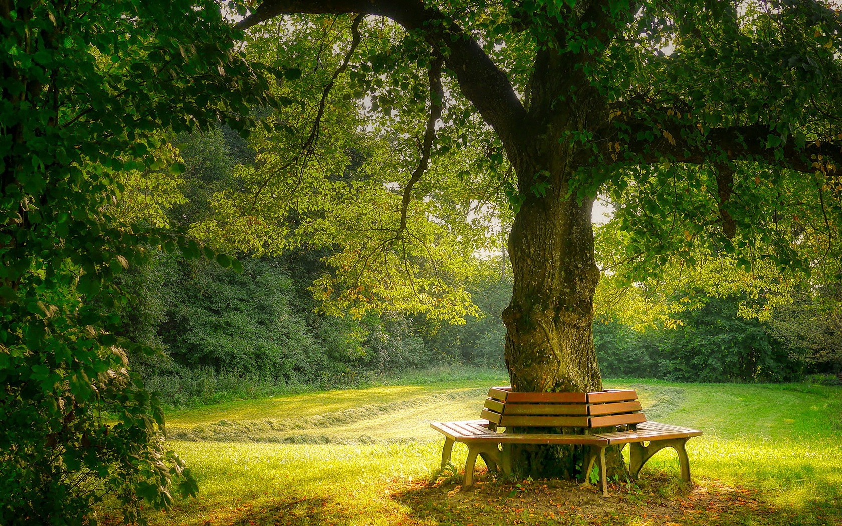 Description: A bench under a tree in a park setting with a path in the background and a path in the grass.