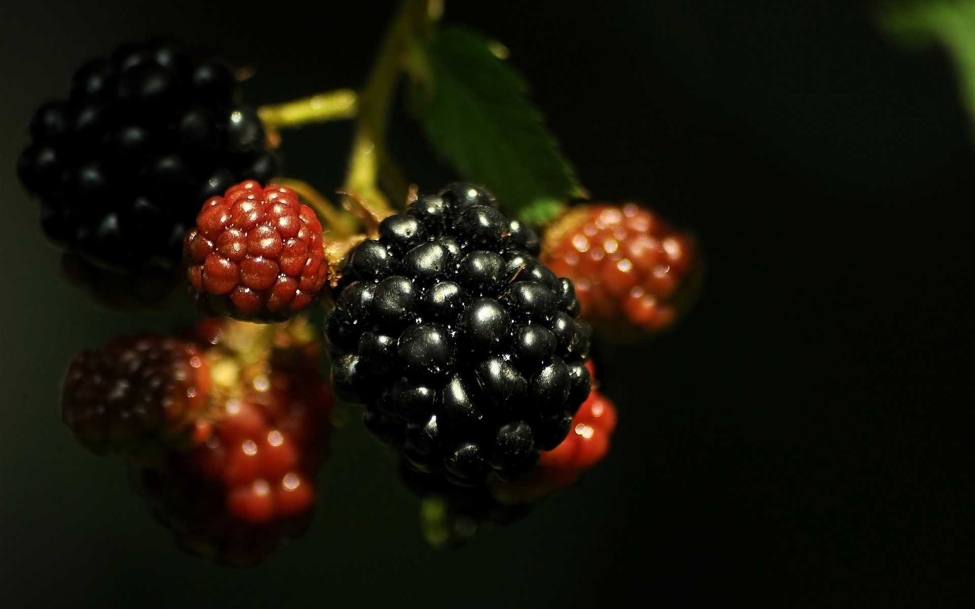 Description: A close up of a bunch of berries on a tree branch with leaves and berries on it.