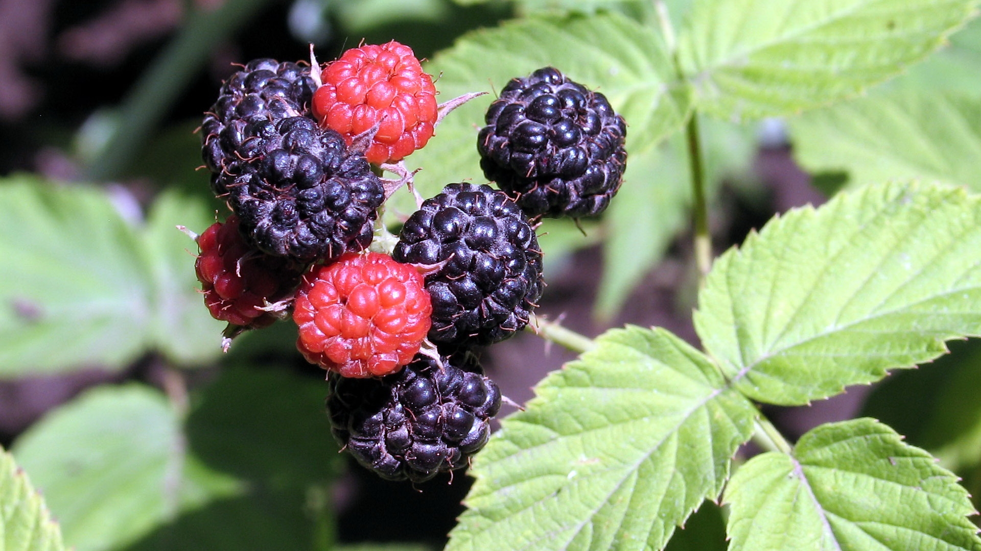 Description: A group of berries on a green leafy plant with red berries on it's end and green leaves.