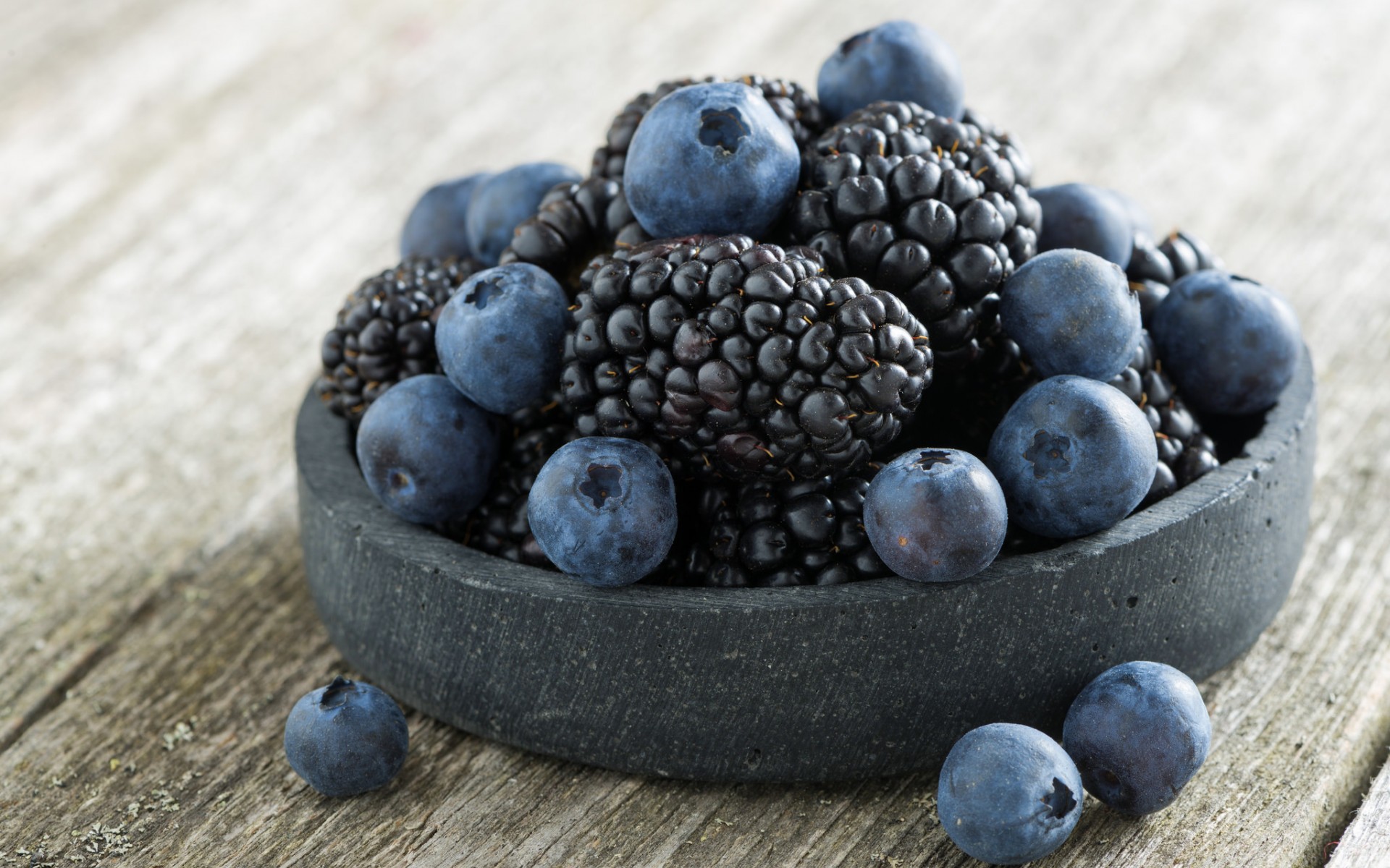 Description: A bowl of berries is sitting on a table with blueberries in it and blackberries in the middle.