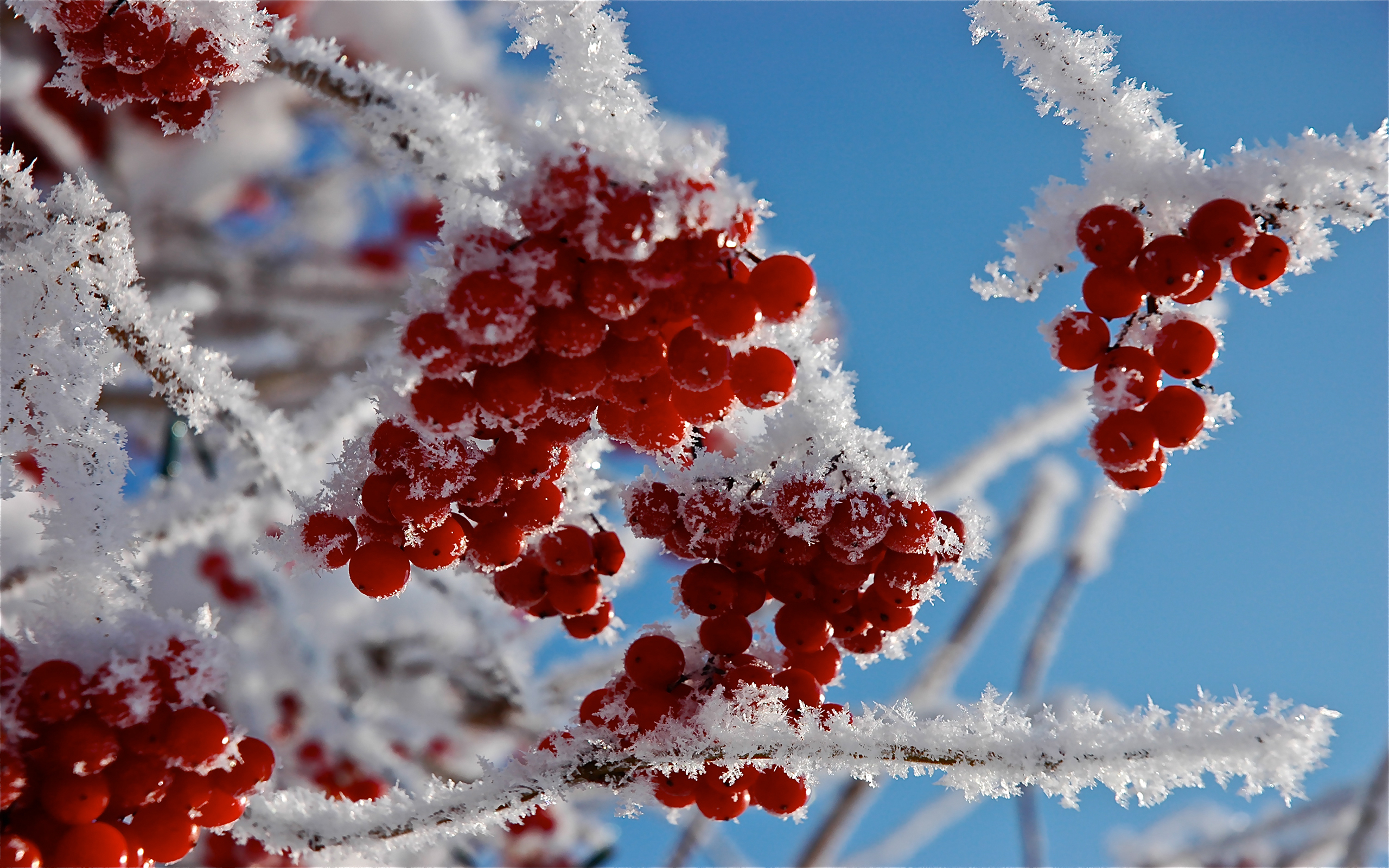 Description: A bunch of berries are covered in snow on a branch with a blue sky in the background.