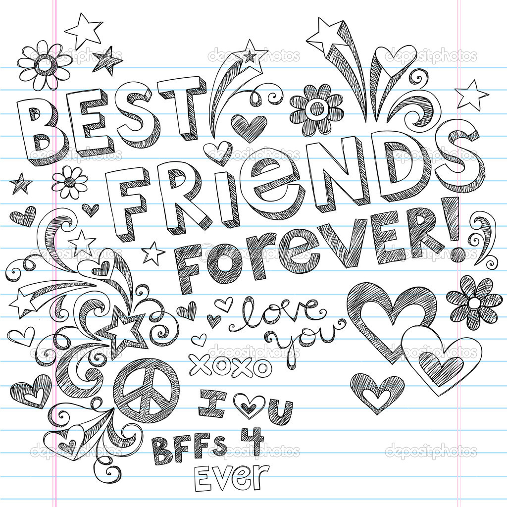 Description: A drawing of a handwritten quote with hearts and stars on lined paper with the words best friends forever.