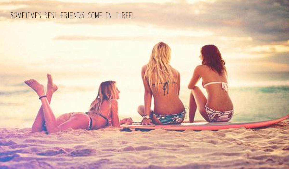 Description: Three women sitting on a surfboard on the beach with the caption sometimes best friends come three feet.