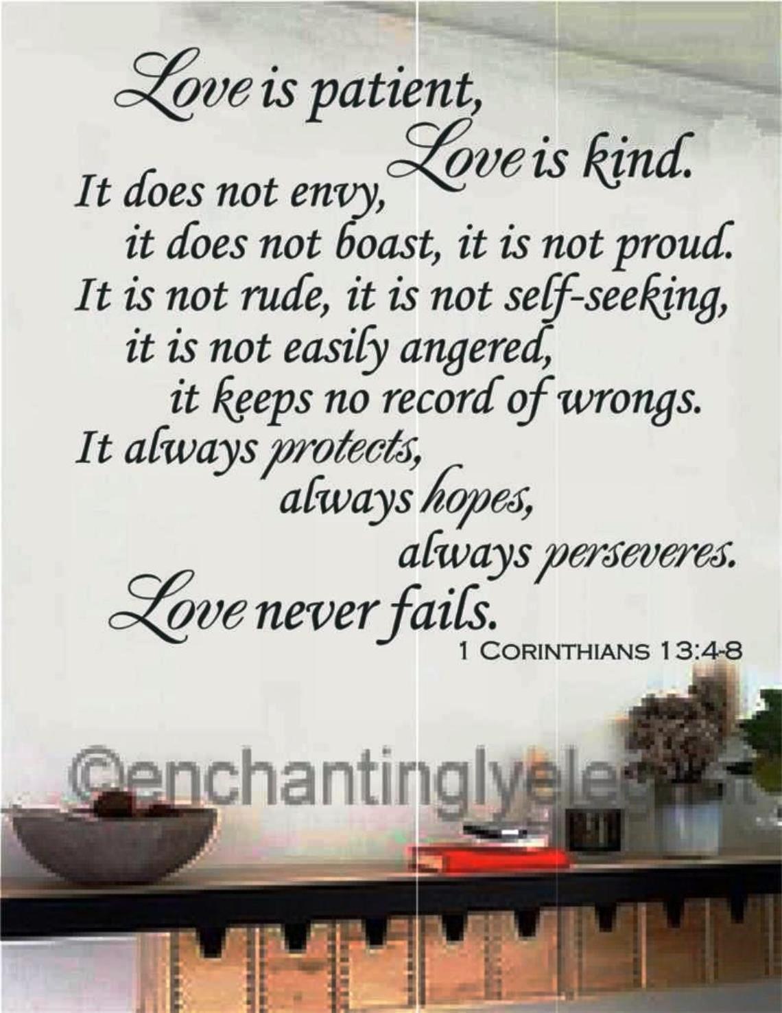 Description: A wall with a bible verse on it and a bowl of fruit on the table in front of it.