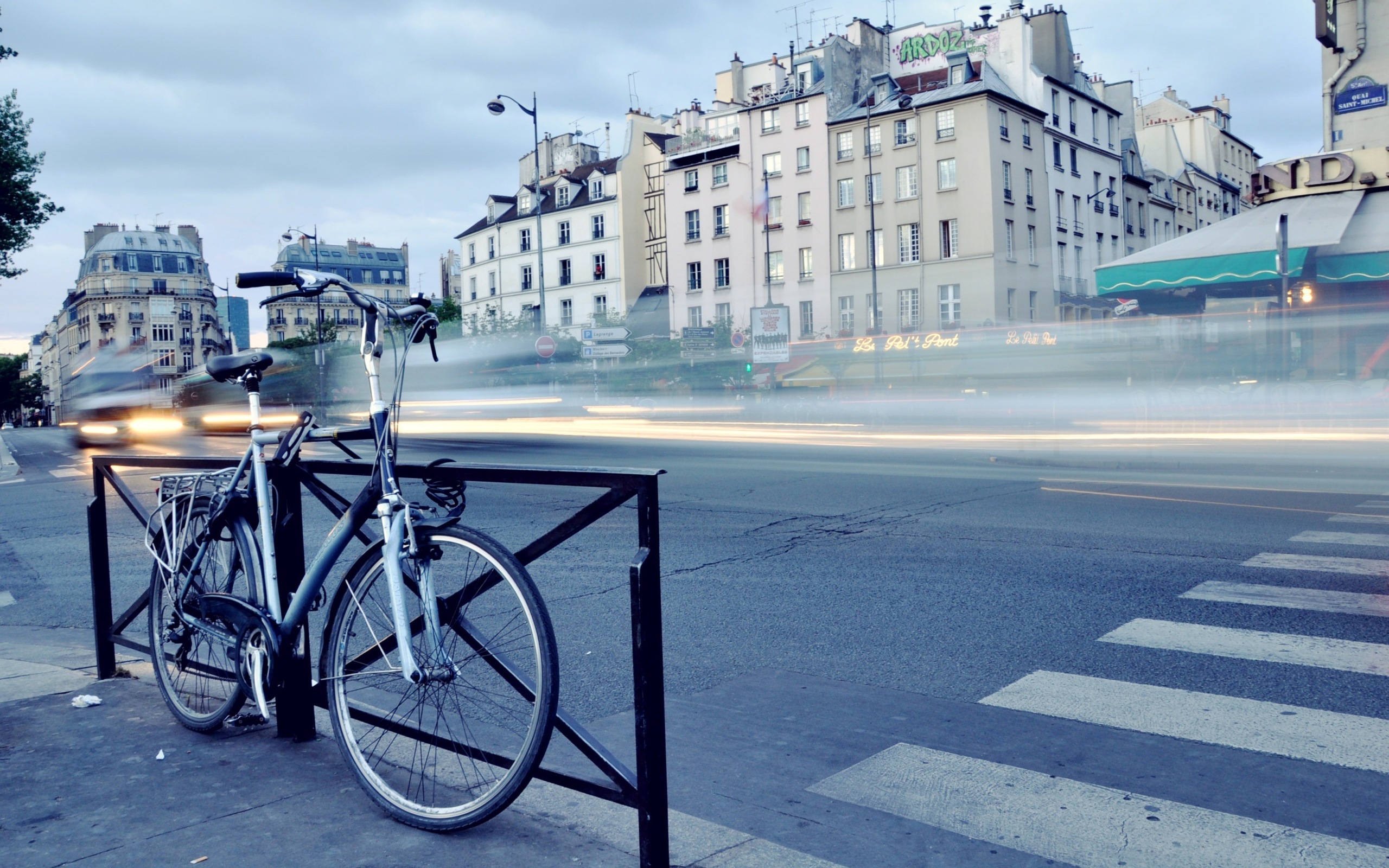 Description: A bicycle parked on a fence next to a street with buildings in the background and a car passing by.