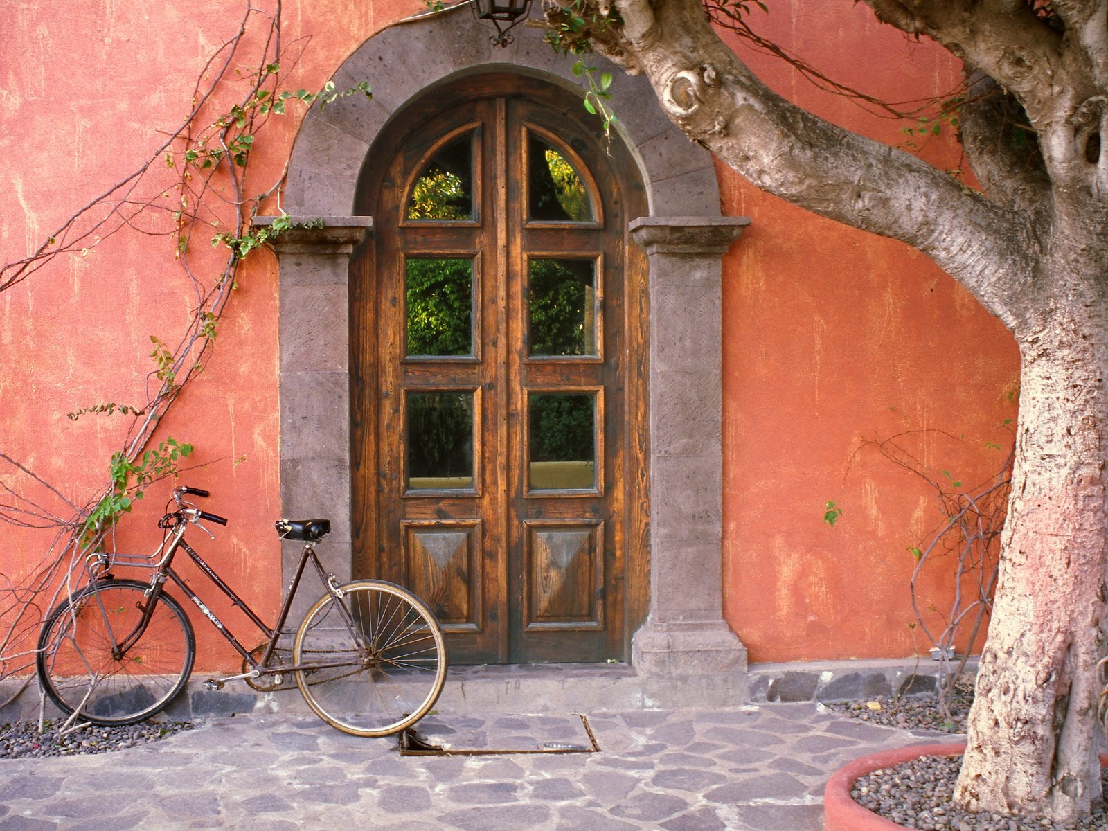 Description: A bicycle parked in front of a door next to a tree and a potted planter with a potted plant.