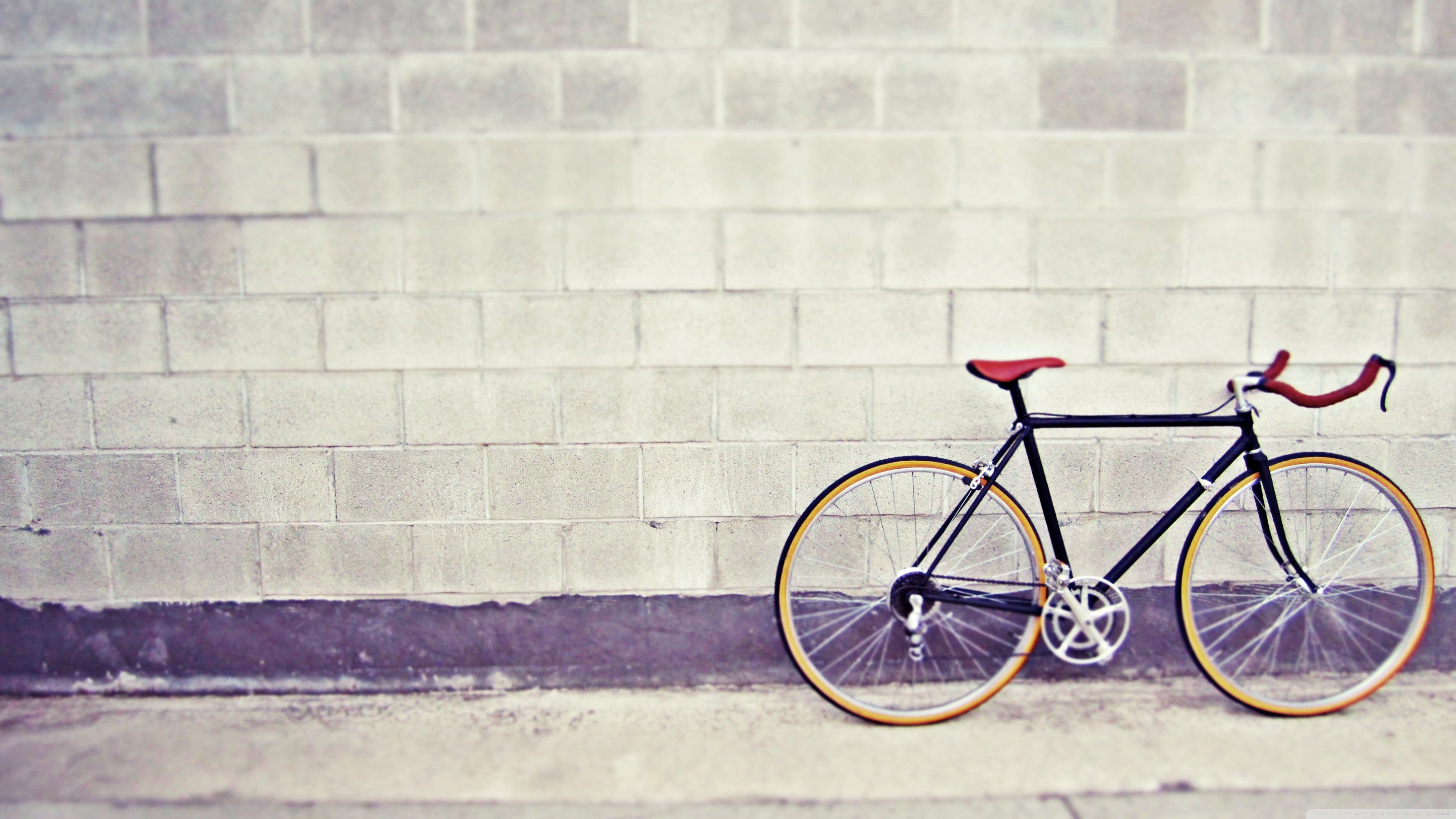 Description: A bike parked on the side of a street next to a brick wall with a red seat on it.