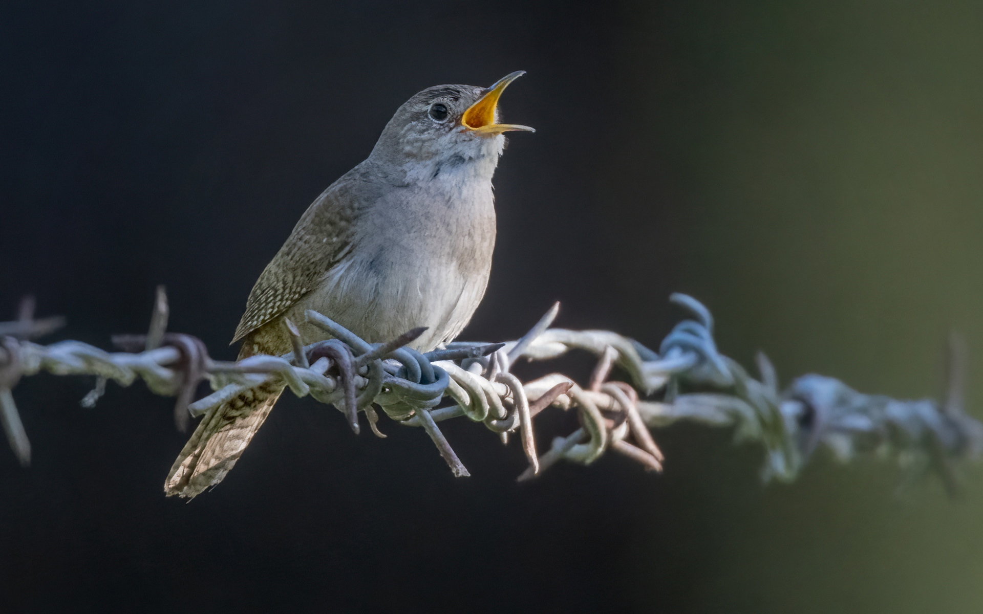 Description: A bird with a yellow beak sitting on a barbed wire fence with its mouth open and tongue out.