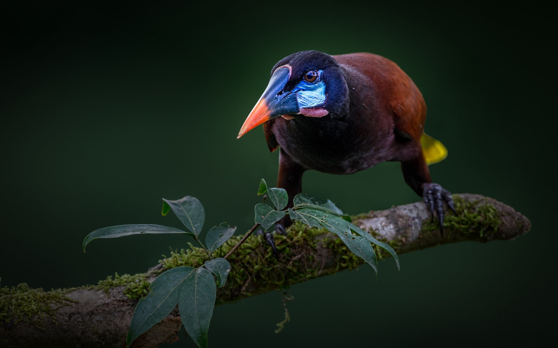 Description: A bird with a blue beak is sitting on a branch with moss and leaves on it's side.