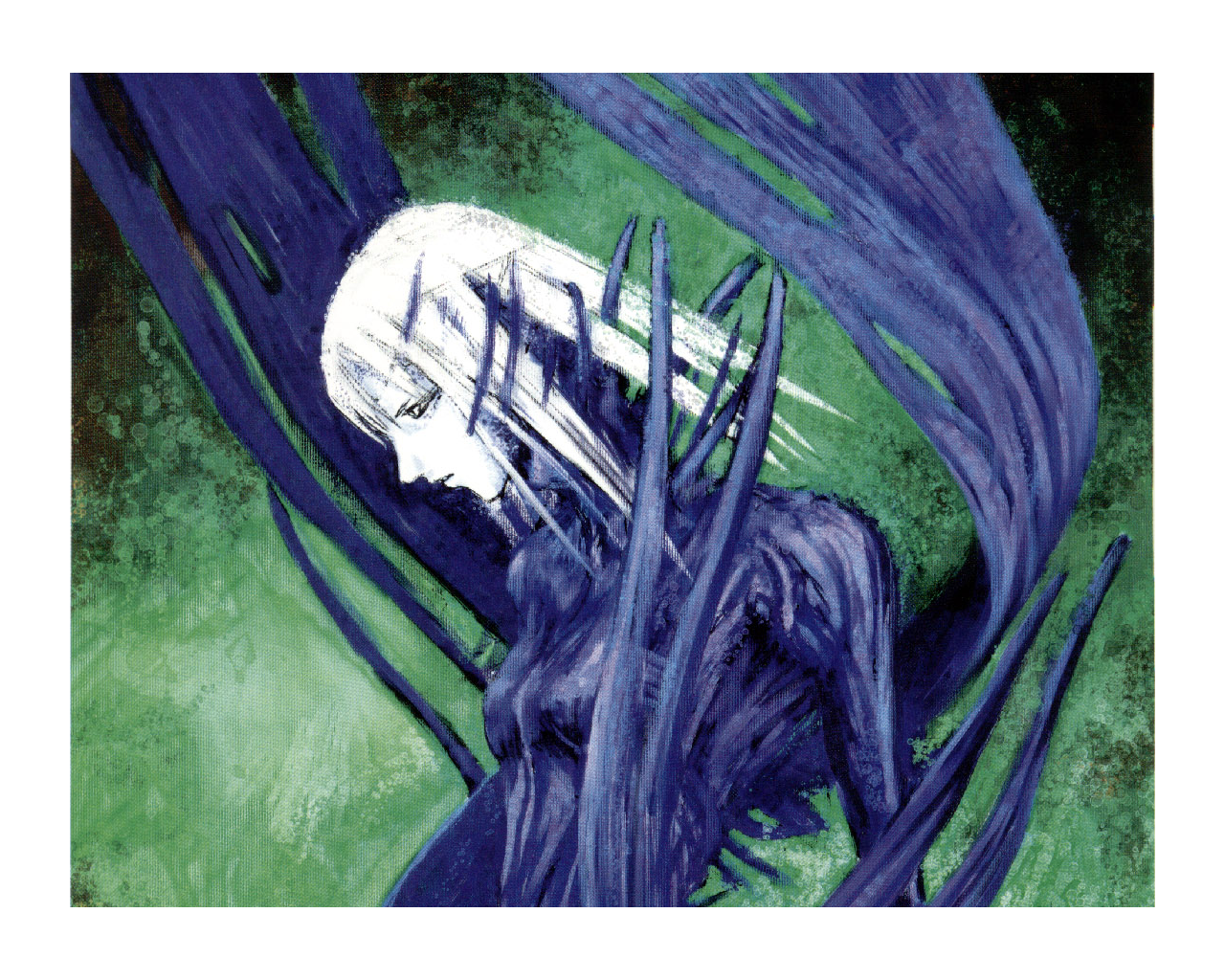 Description: A painting of a bird with long blue feathers and a white bird on it's back end.