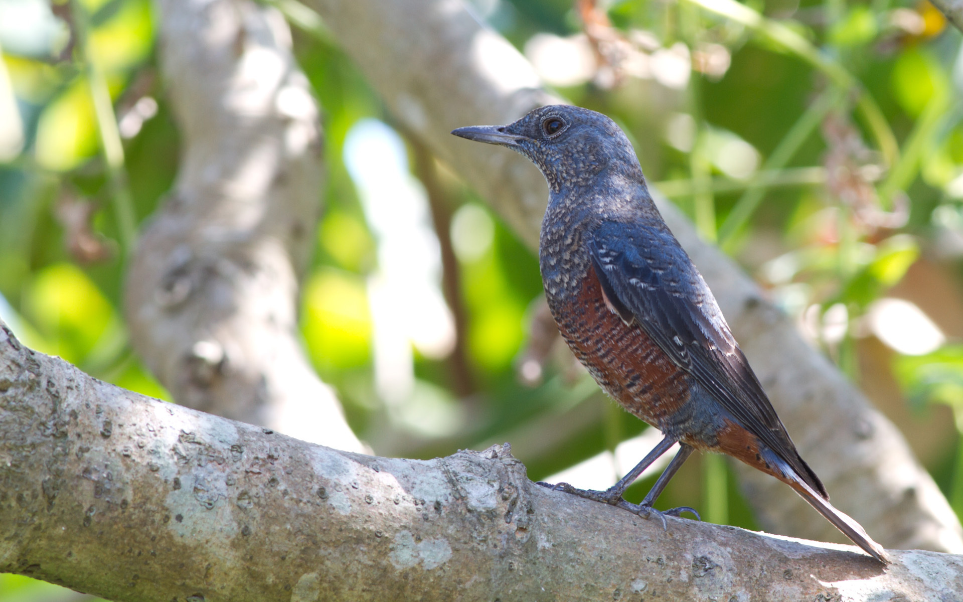 Description: A bird sitting on a tree branch in a forest area with green leaves in the background and a blurred background.