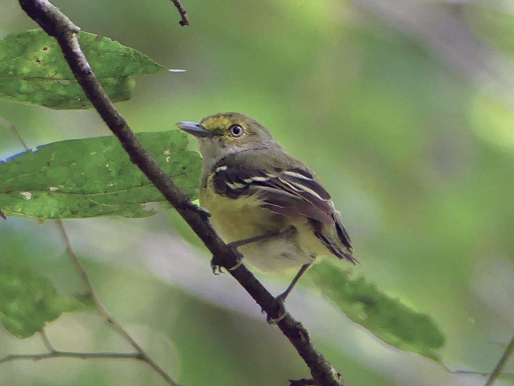 Description: A bird sitting on a branch with leaves in the background and a blurry background of leaves and branches.