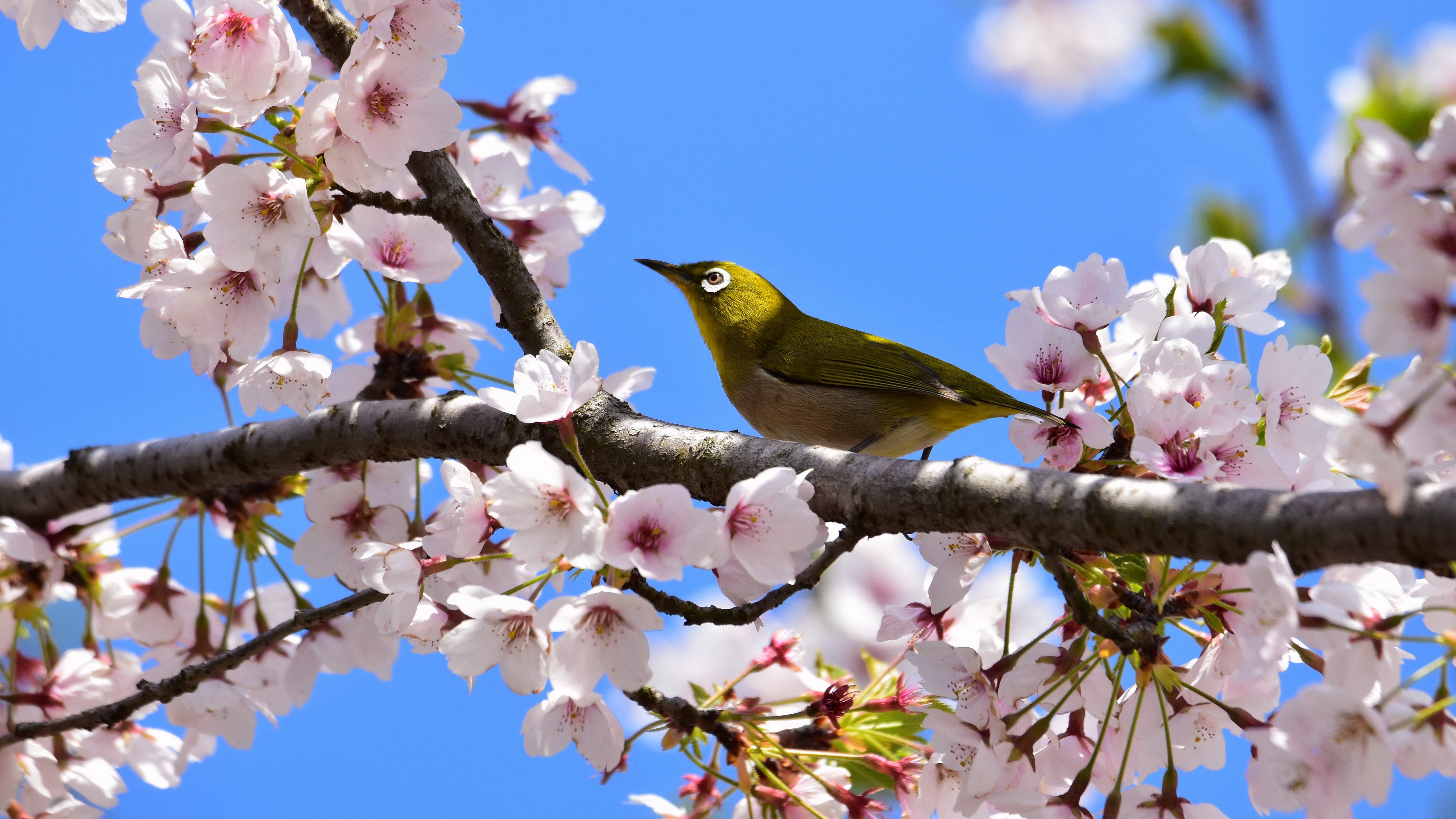Description: A bird is perched on a branch of a tree with pink flowers in the background of a blue sky.