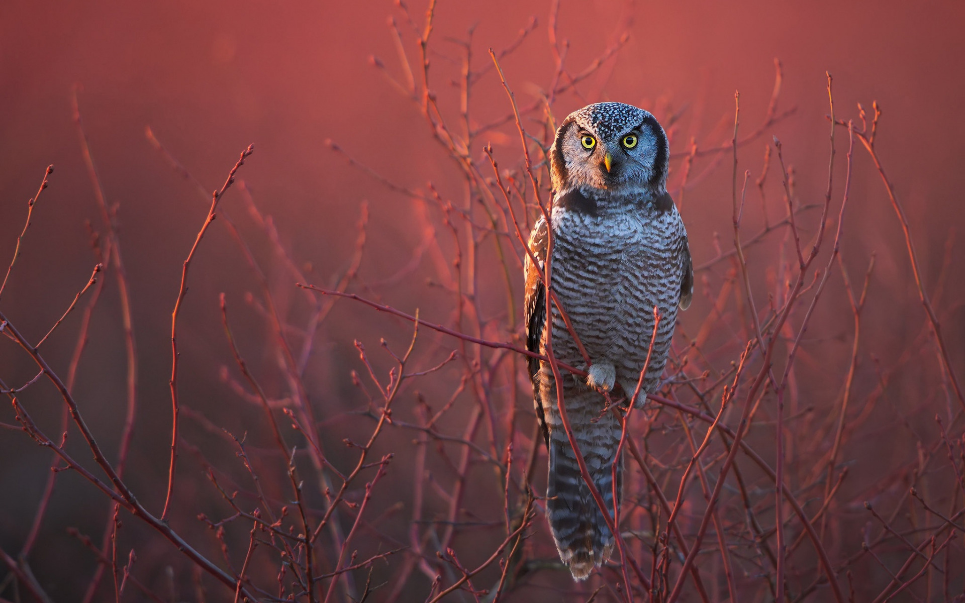 Description: A bird perched on a branch in a tree with red background and red leaves in the foreground.