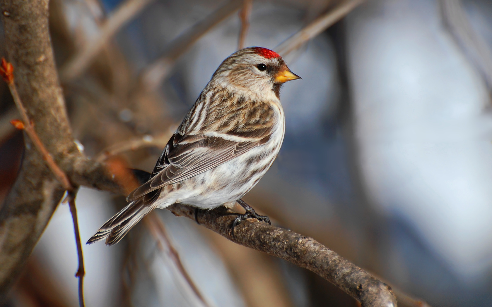 Description: A bird sitting on a branch of a tree with no leaves on it's branches and a red head.