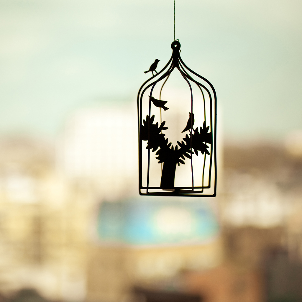 Description: A bird in a cage hanging from a wire with a city in the background and a bird in the tree.