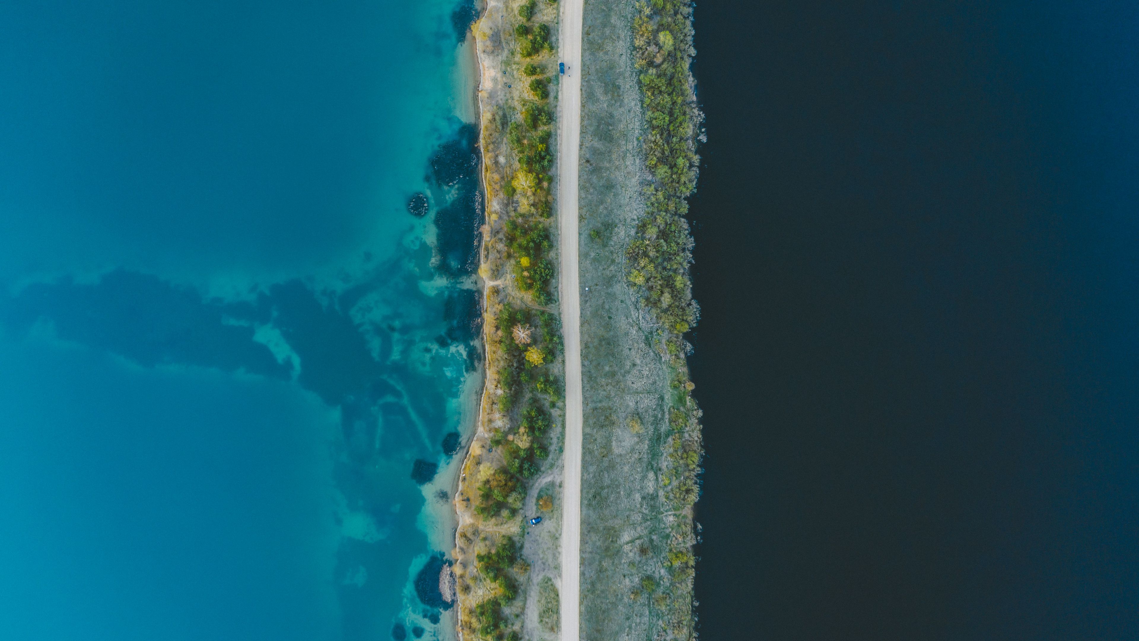 Description: A bird's eye view of a road and a body of water with a plane flying over it.