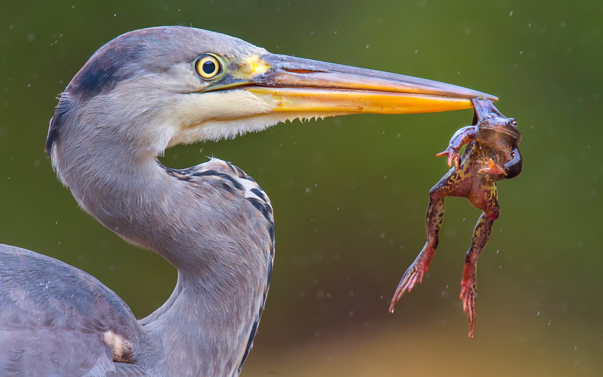 Description: A bird with a fish in its mouth and a crab in its mouth.