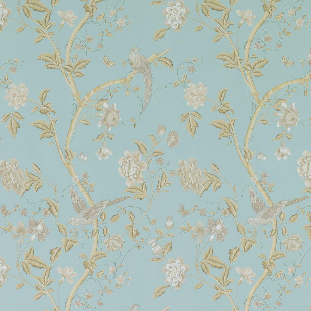 Description: A wallpaper with a bird and flowers on it in a blue room with a white wallpaper and a blue background.