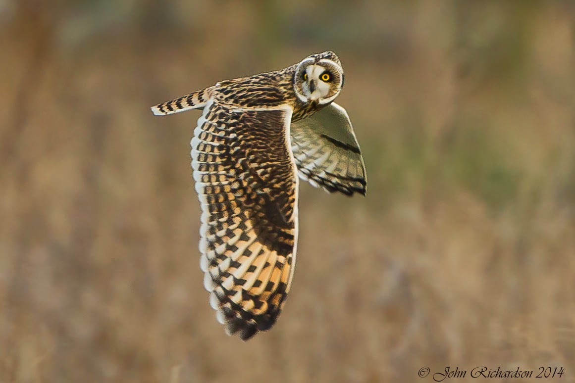 Description: A bird flying through the air with a blurry background of grass and trees in the background.