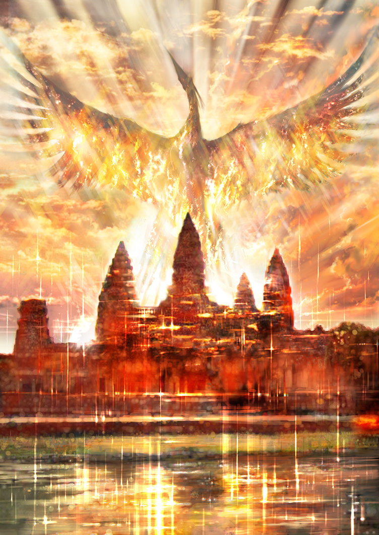 Description: A painting of a bird flying over a city with a lake in front of it and a sunset in the background.