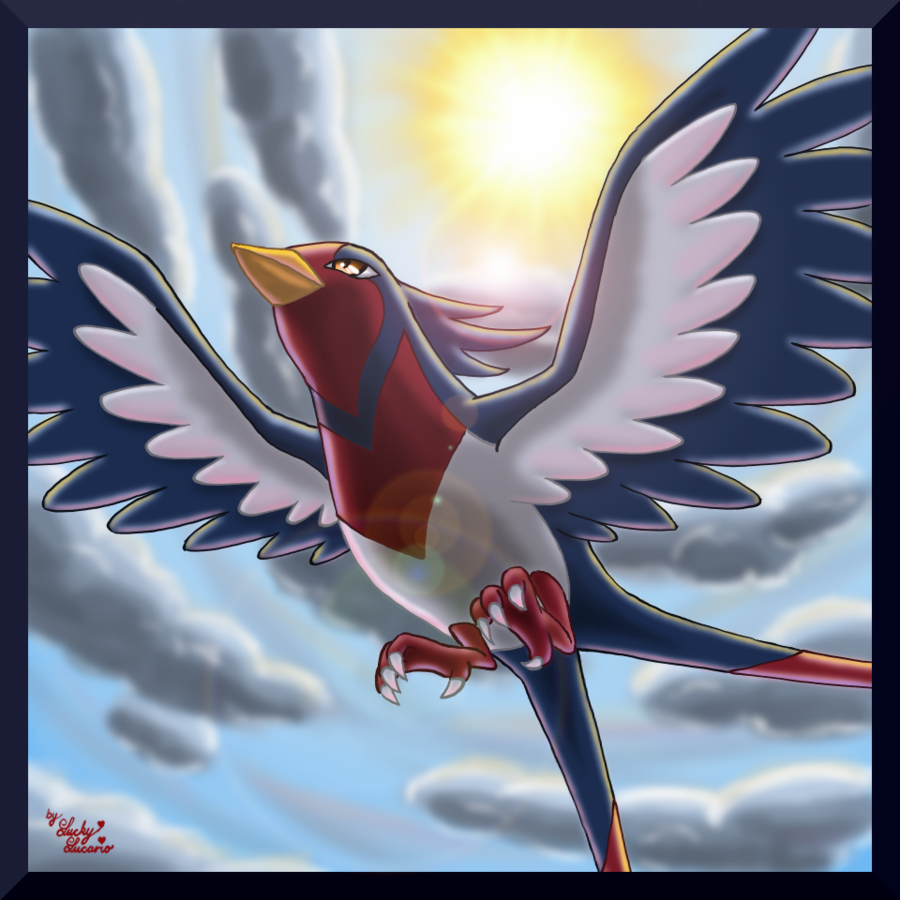 Description: A bird flying through the air with clouds in the background and a sun in the sky above it with a blue frame.