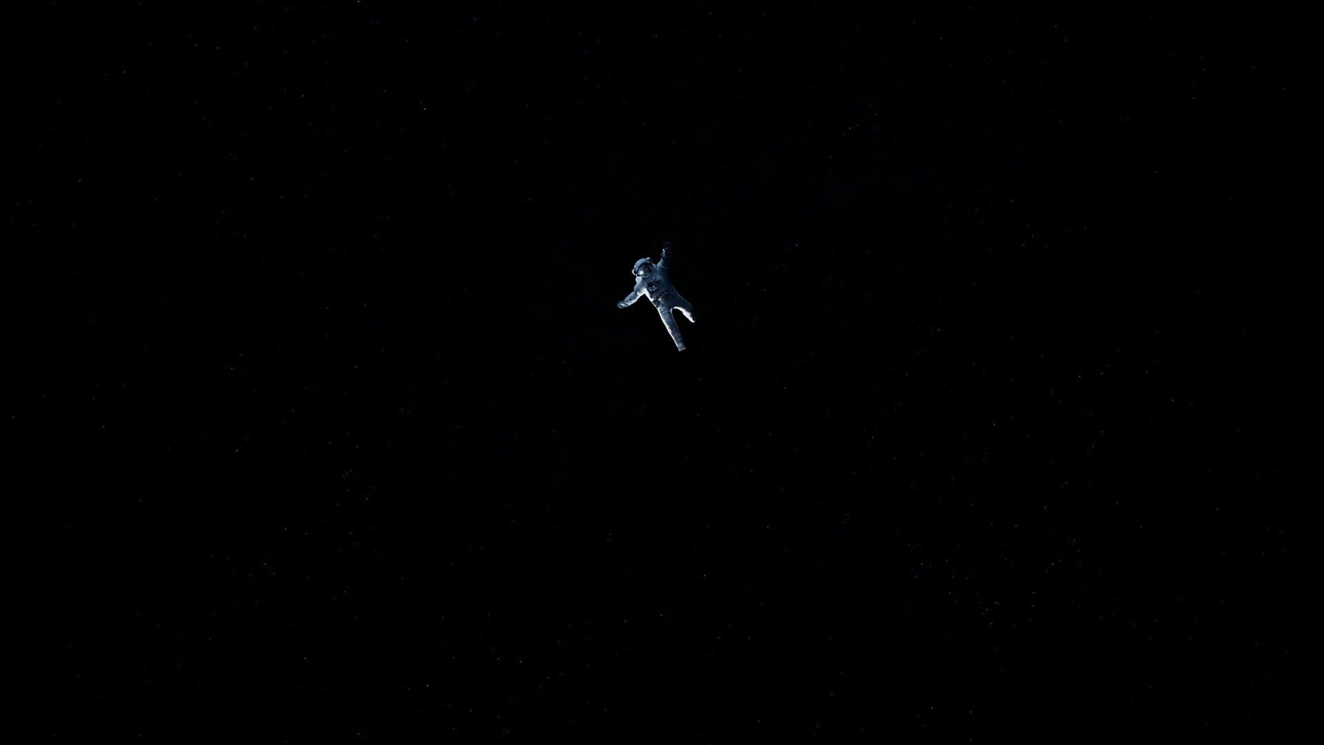 Description: A bird flying in the dark with a dark background and a white bird on the left side of the photo.