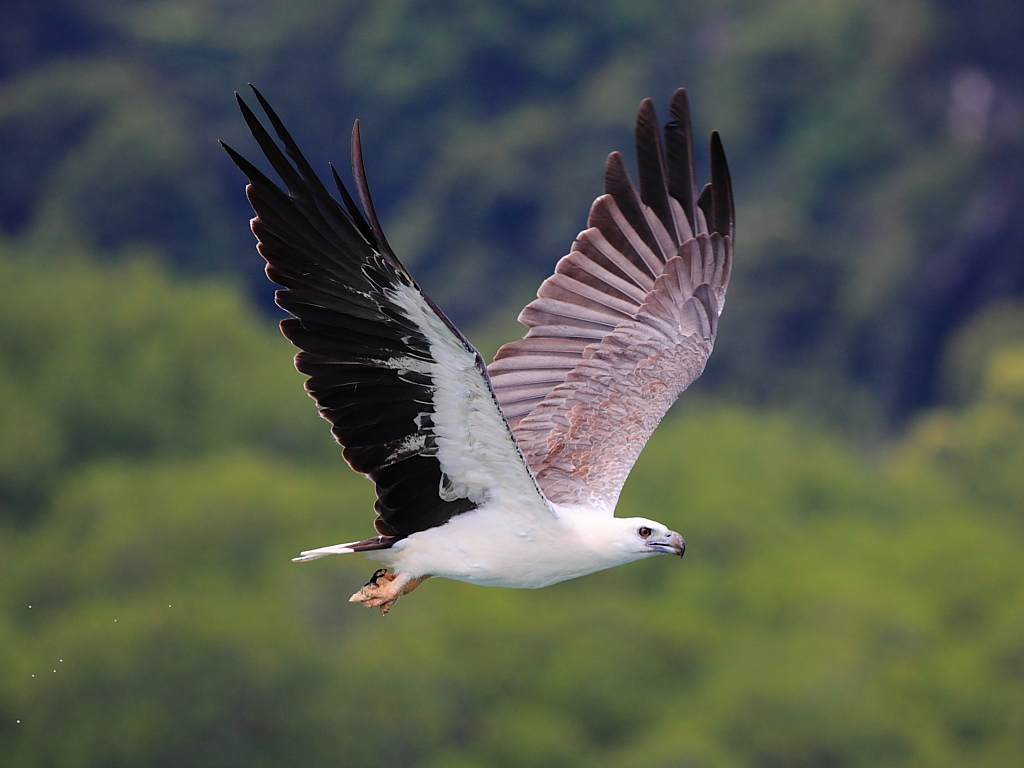 Description: A bird flying over a lush green forest covered hillside top covered in trees and bushes.