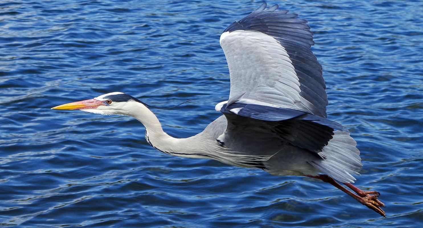Description: A bird flying over a body of water with a fish in it's mouth and wings spread out.