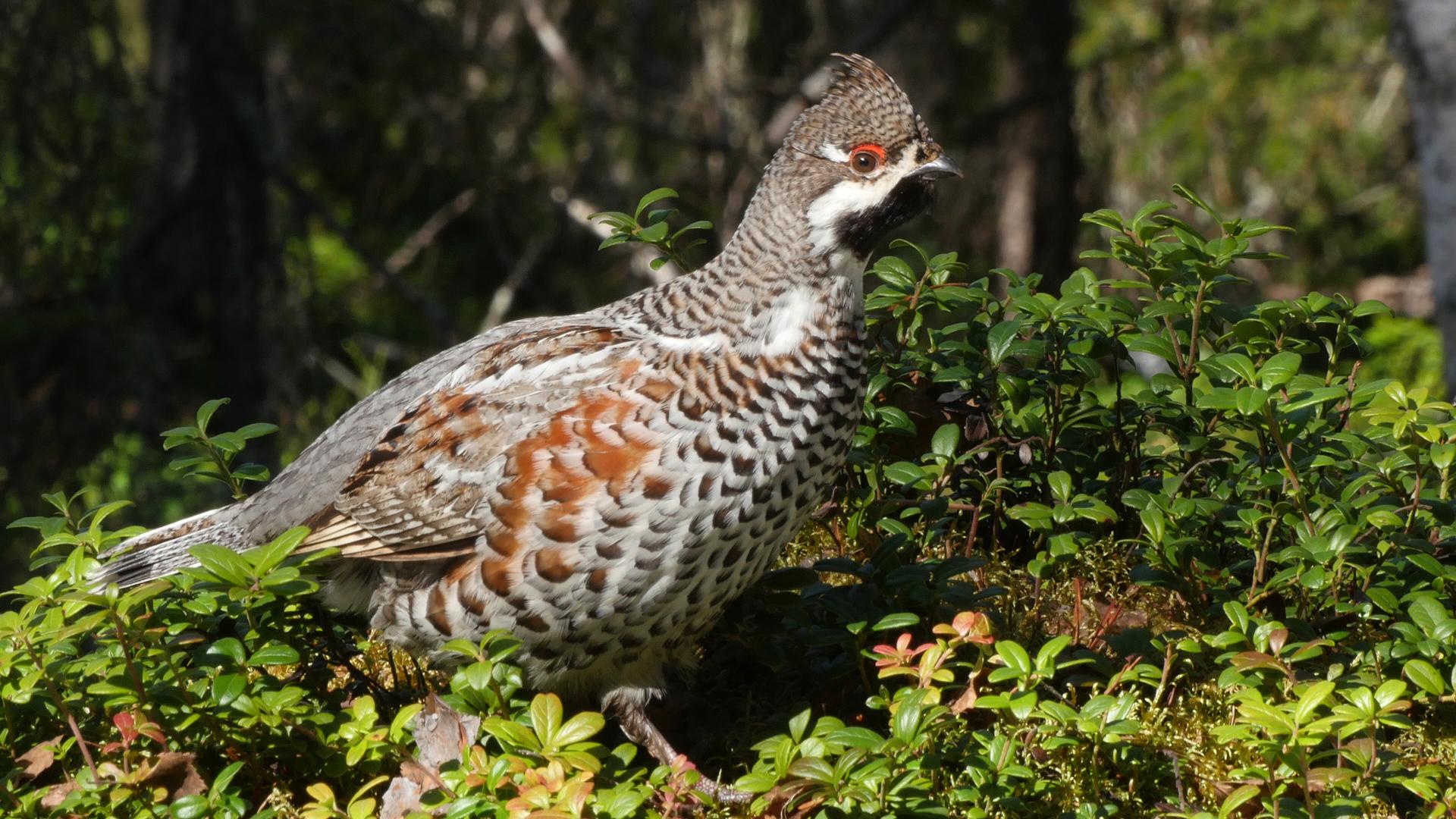 Description: A bird standing on top of a lush green field next to trees and bushes in the forest with red eyes.