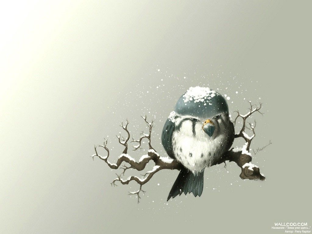 Description: A bird with glasses sitting on a branch covered in snow and snow flakes.