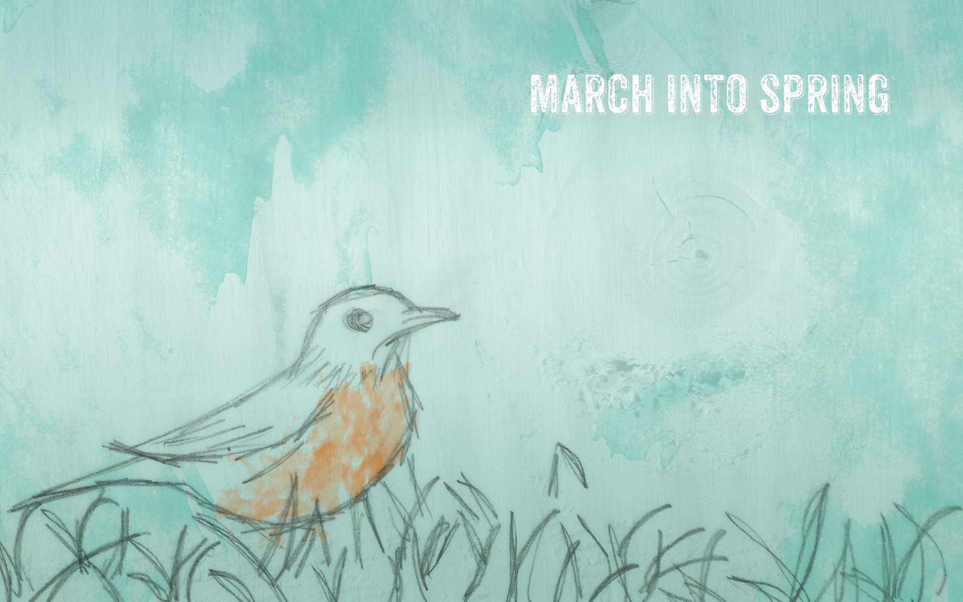 Description: A drawing of a bird sitting in the grass with a message written on it that reads march into spring.