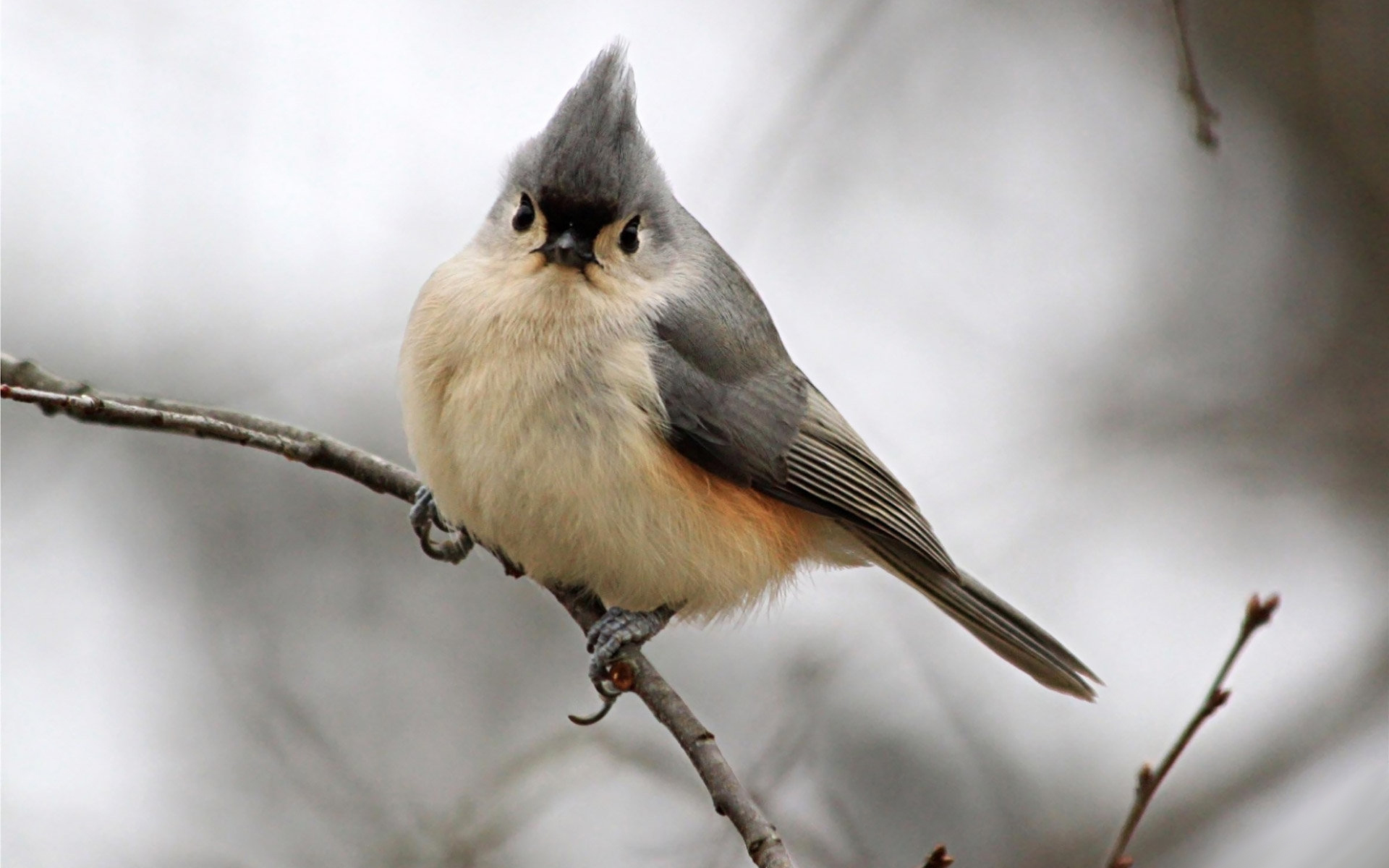 Description: A bird sitting on a branch with a blurry background of trees and branches in the background.