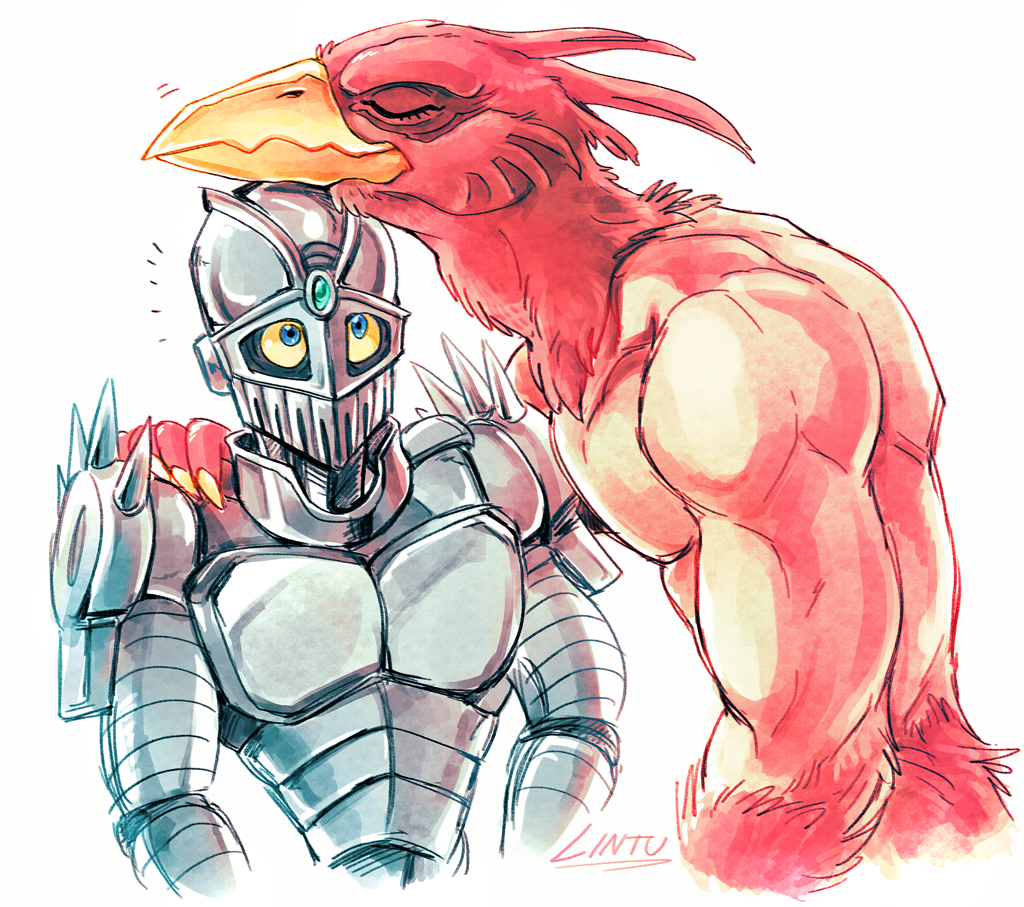 Description: A drawing of a bird and a knight in armor with a bird on their head and a bird on their shoulder.