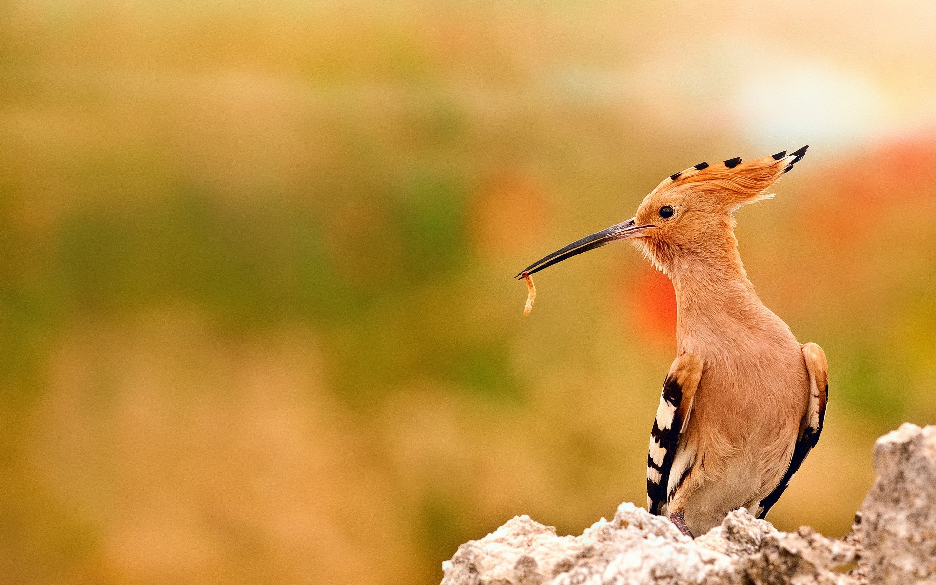 Description: A bird with a long beak standing on a rock with a flower in its mouth and a blurry background.
