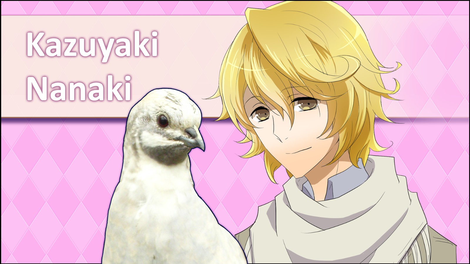 Description: A white bird standing next to a man in a pink background with a pink background and a pink background with a pink background.